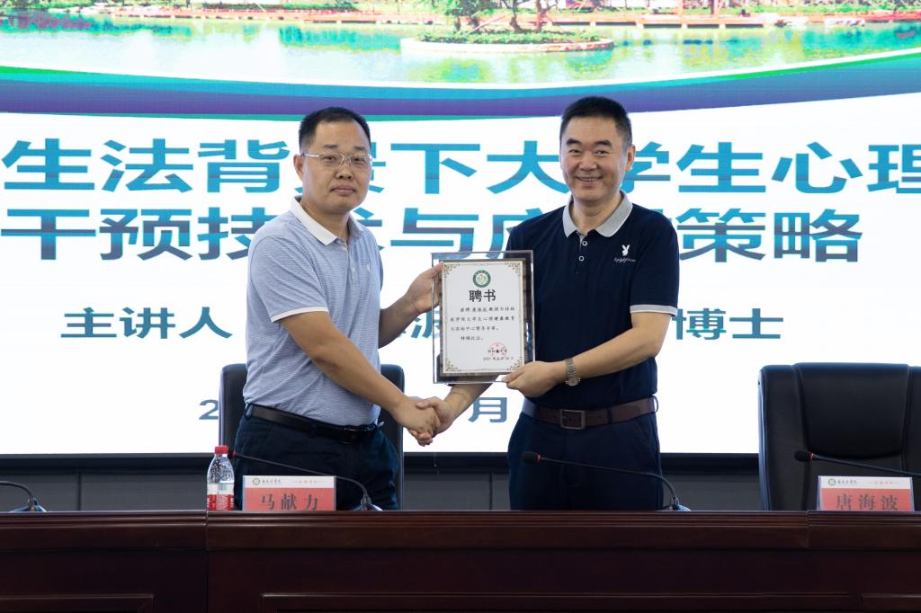 我校聘请唐海波教授为我校大学生心理健康教育与咨询中心督导专家。副院长马献力出席讲座,并为其颁发聘书。