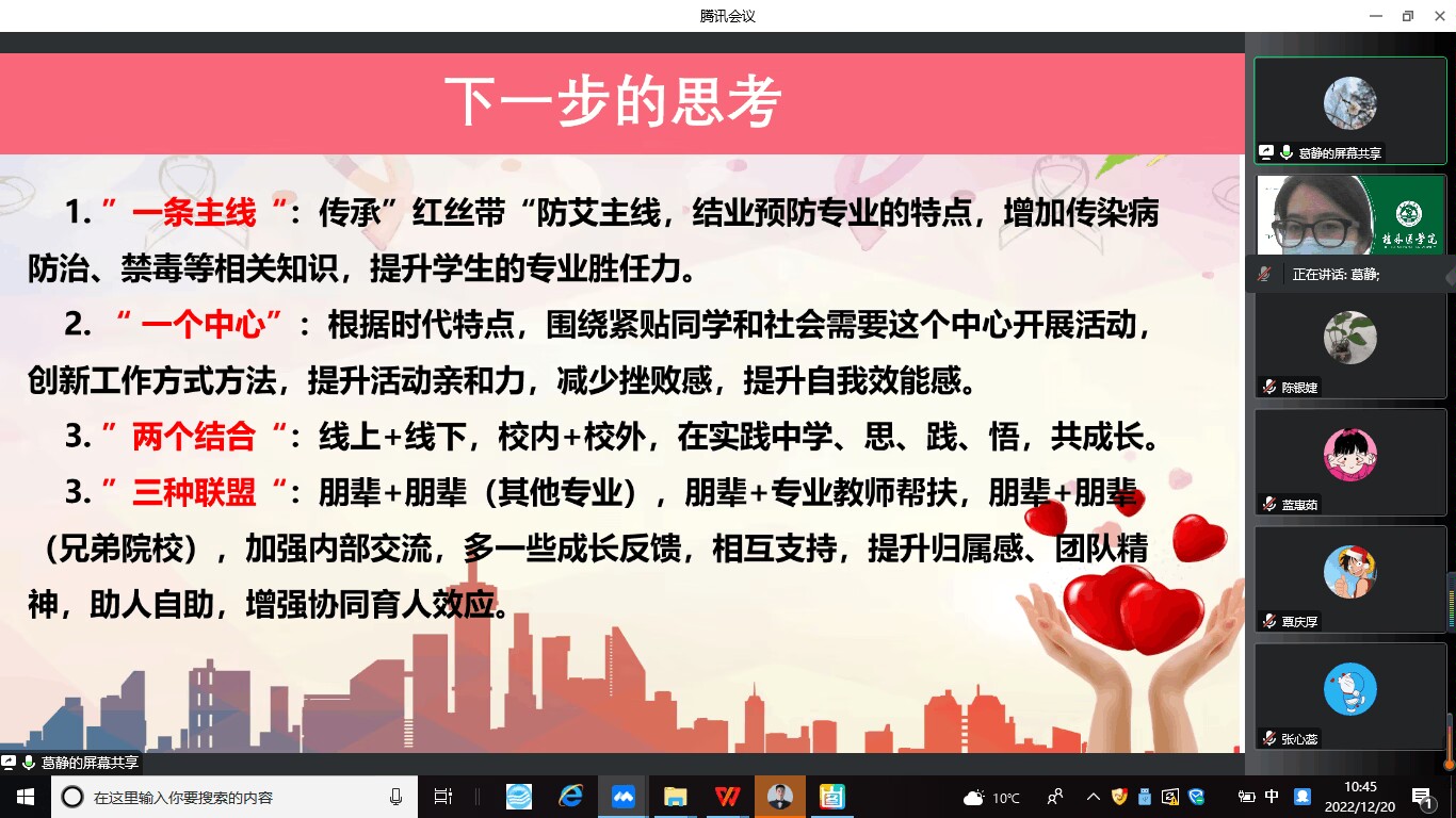 2022年12月20日上午,学生工作部通过线上线下相结合的方式组织召开了2022年“致远健康行”一院一品特色项目结题评审会。校党办院办副主任骆泽盛、宣传部副部长刘梦青、学生工作部副部长朱四化、大学生心理健康教育与咨询中心全体教师以及各二级学院(系)心理工作站站长、副站长、“致远健康行”一院一品特色项目负责老师出席会议。会议由大学生心理健康教育与咨询中心主任李艳萍主持。