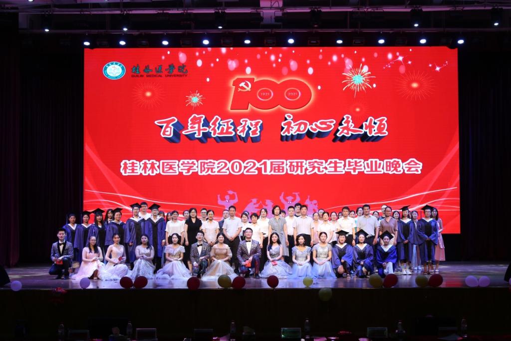 为庆祝中国共产党百年华诞,表达对2021届毕业研究生的美好祝愿,“百年征程,初心永恒”2021届研究生毕业晚会于6月19日晚在临桂校区大学生活动中心四楼演艺厅举行。学校党委常委、副院长陈旭出席了晚会,研究生学院、研究生工作部、校团委和各研究生培养单位领导,研究生导师代表,研究生辅导员及全体研究生参加晚会。