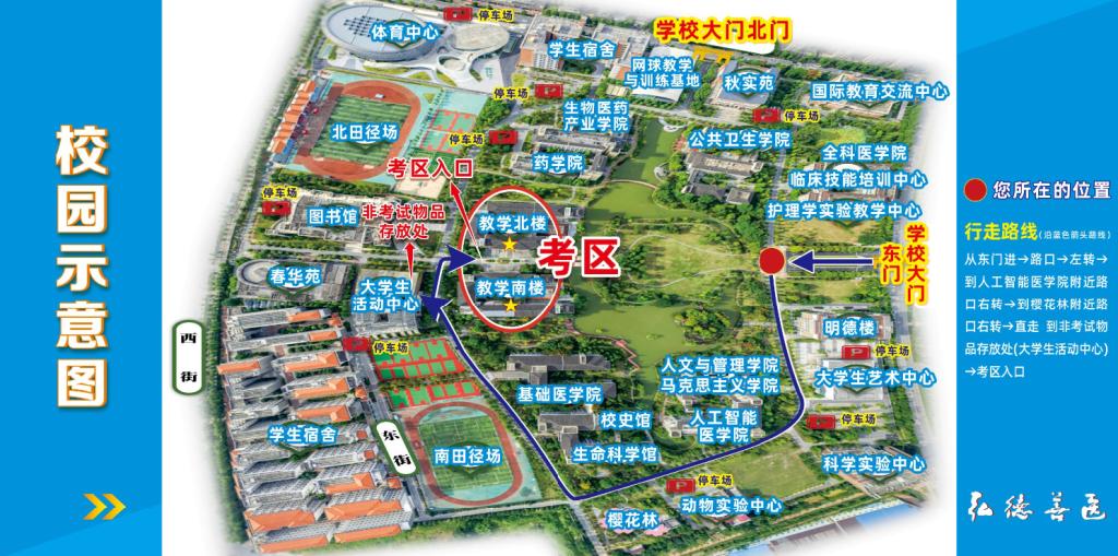 三、考生入校及安检流程。校外考生7:00/12:30从东门可以进入考点。所有考生按照路线标示到大学生活动中心一楼暂时放置手机、手表、电子手环及其它含有通讯功能的个人物品;7:30/13:00到达教学南楼及北楼间的安检门处等待安检,通过安检和人脸识别(身份证核验)后进入南北楼广场区域(考区)等待,手机、手表、电子手环及其它含有通讯功能的物品严禁带入考区。7:50/13:20考生依照广播指令可以进入教学楼,考生书包、书本、水杯等非考试物品放在考场门口的“非考试物品存放处”,接受第2次人工安检后进入考场。如在教室考场内发现携带通讯工具者,一律按违纪作弊处理!请考生按照标识或工作人员指引有序入场,避免拥挤喧闹。
